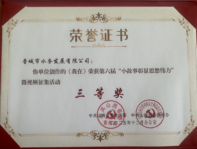 2025年10月,晉城市水務發(fā)展有限公司參加由中共山西省委宣傳部、中共山西省委網(wǎng)信辦聯(lián)合舉辦的第六屆山西省“小故事彰顯思想偉力”微視頻征集活動,作品《我在》榮獲三等獎。